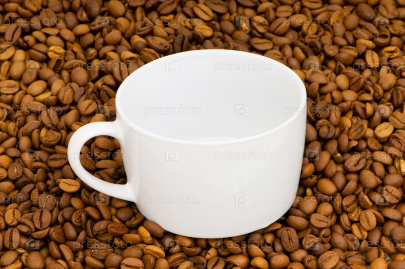 Белая чашка на фоне из кофейных зерен