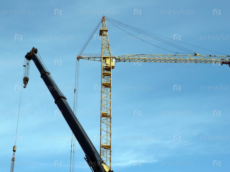 Стрелы двух башенных кранов на фоне неба