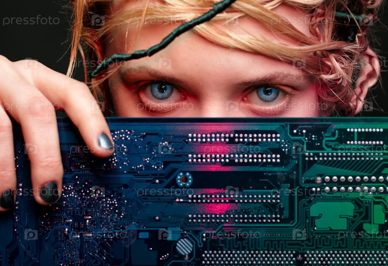 Красивая женщина с материнской платой