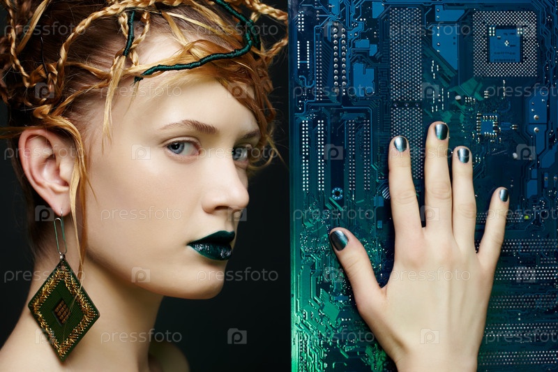 Красивая женщина с материнской платой