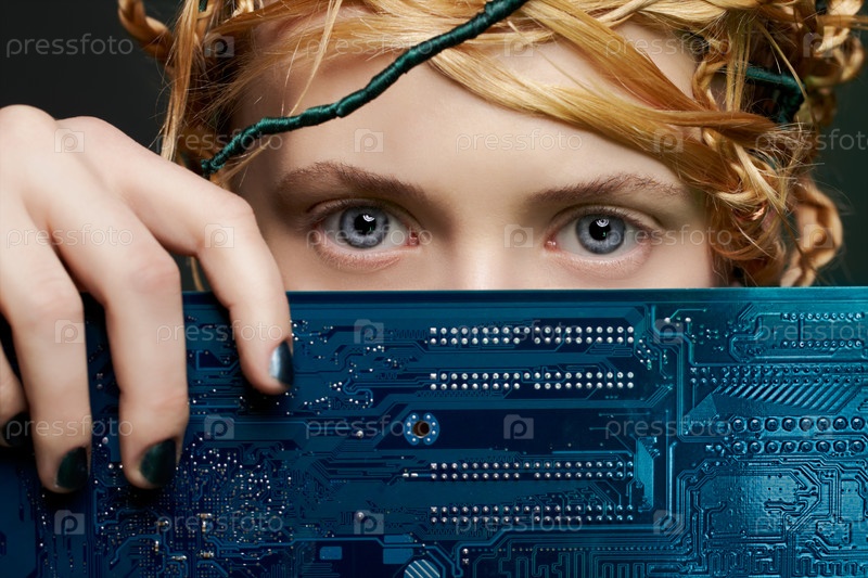Красивая женщина с материнской платой