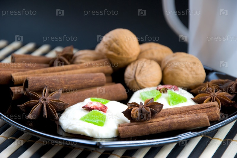 Черная тарелка с конфетами, корицей, анисом и грецкими орехами
