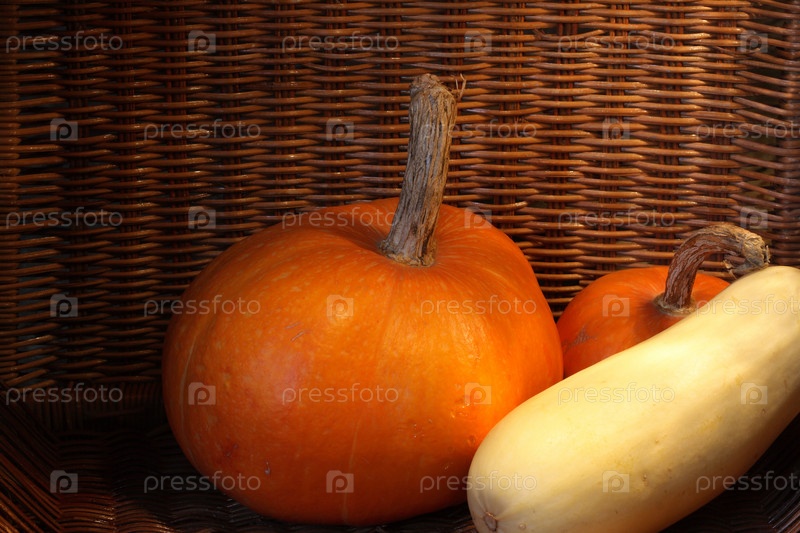 Две тыквы и кабачок в плетеной корзине