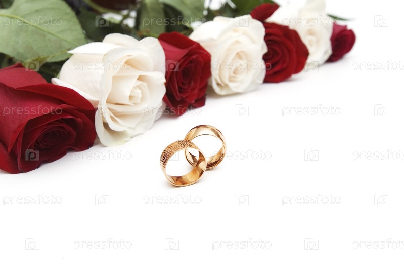 Золотые обручальные кольца и розы на белом