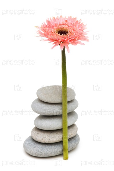 Красный цветок герберы и галька на белом фоне