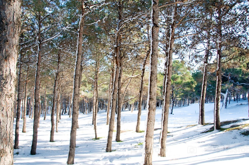 Лес в яркий солнечный зимний день