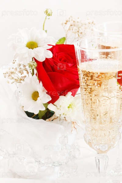Шампанское и свадебный букет