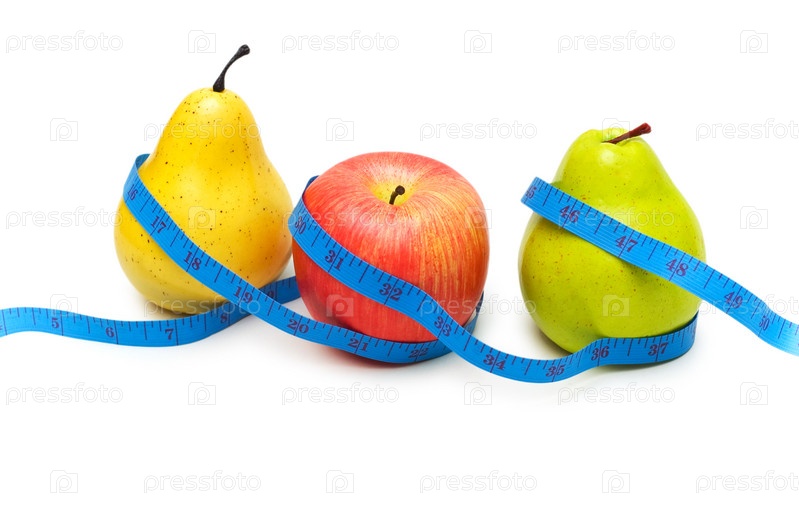 Груши и яблоки с сантиметровой лентой на белом фоне