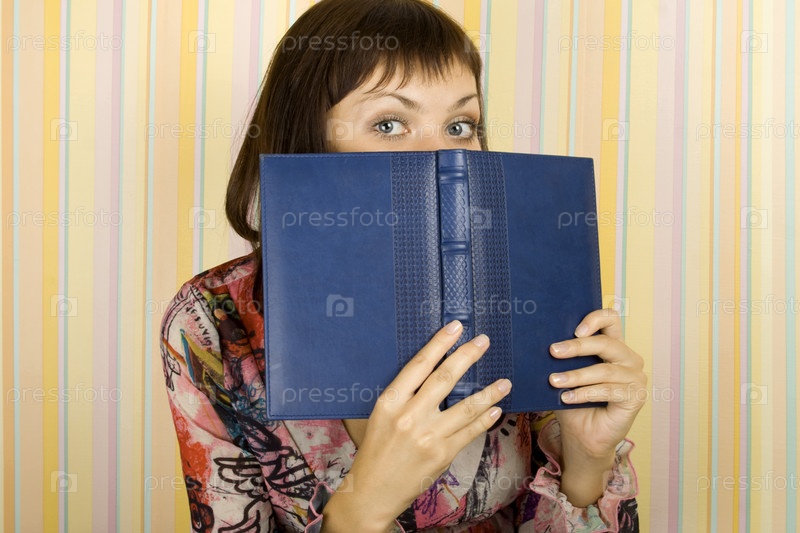 Девушка с книжкой на фоне полосатых обоев