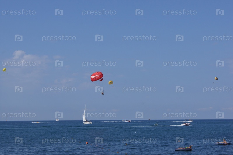 Парашютисты, садящиеся в воду на берегу моря