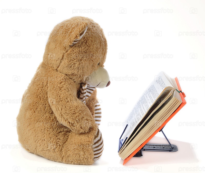 Плюшевый мишка, читающий книгу, изолированный на белом фоне