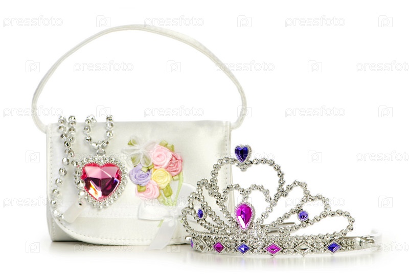 Сумка, кулон и диадема, изолированные на белом фоне