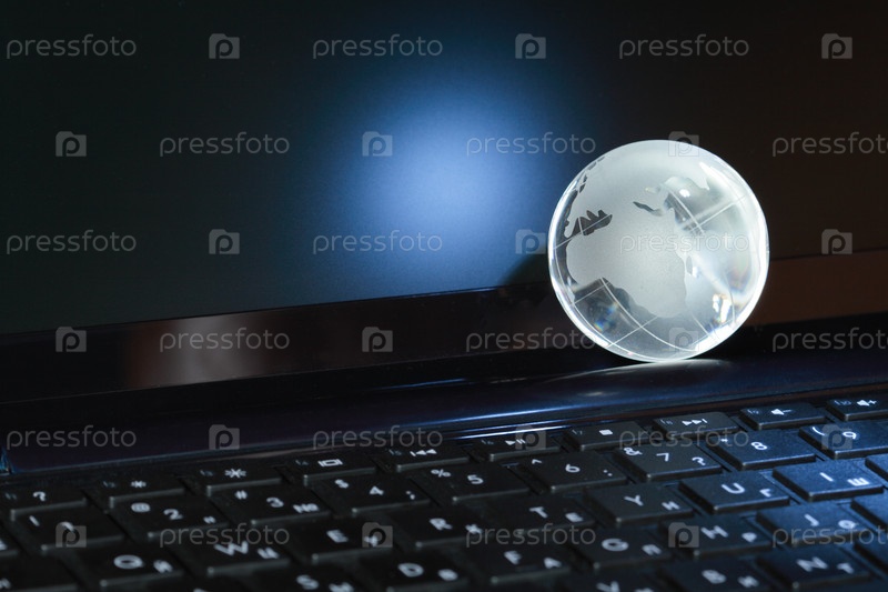 Крупным планом стеклянный глобус на черной клавиатуре компьютера