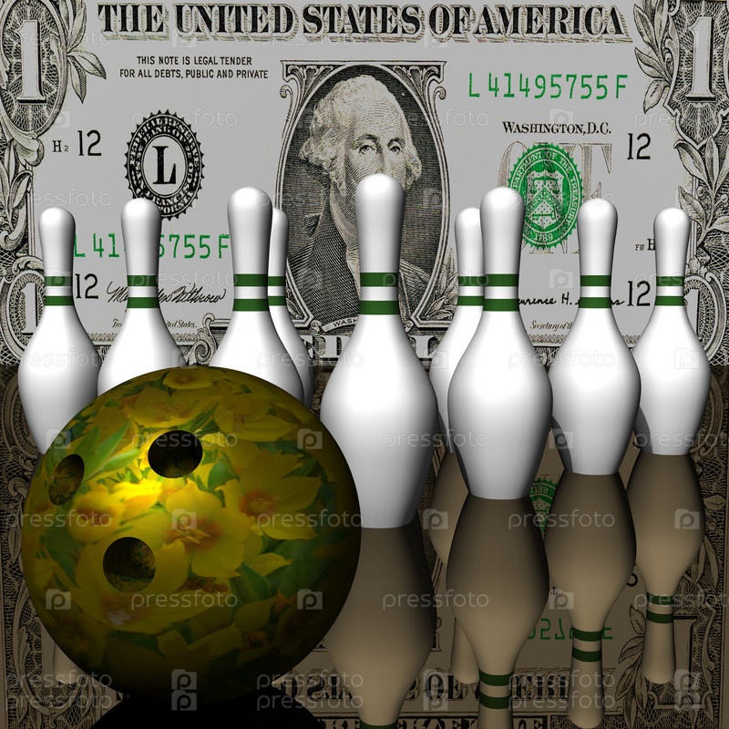 Кегли и мяч для боулинга на фоне доллара, 3d