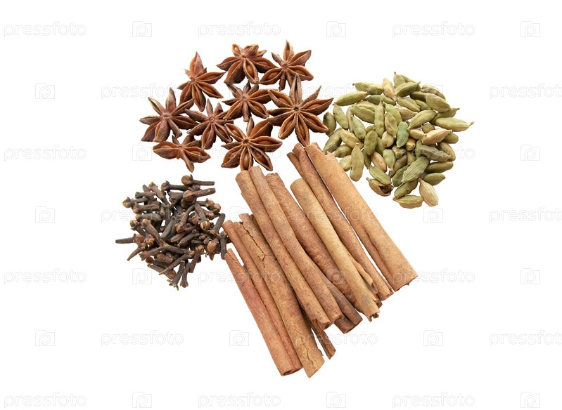 Специи для глинтвейна (гвоздика, корица, кардамон и бадьян) на белом фоне