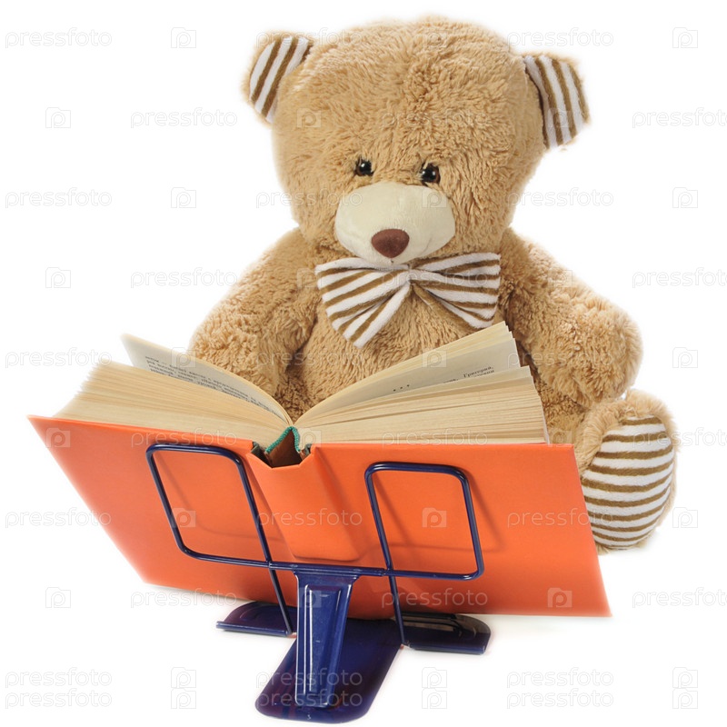 Плюшевый мишка с книгой на белом фоне