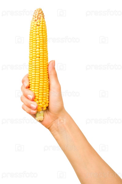 Рука держит початок кукурузы на белом фоне
