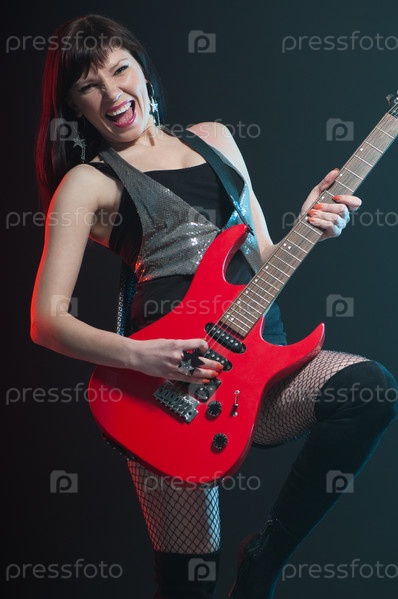 Экспрессивная девушка играет на электрогитаре, темный фон