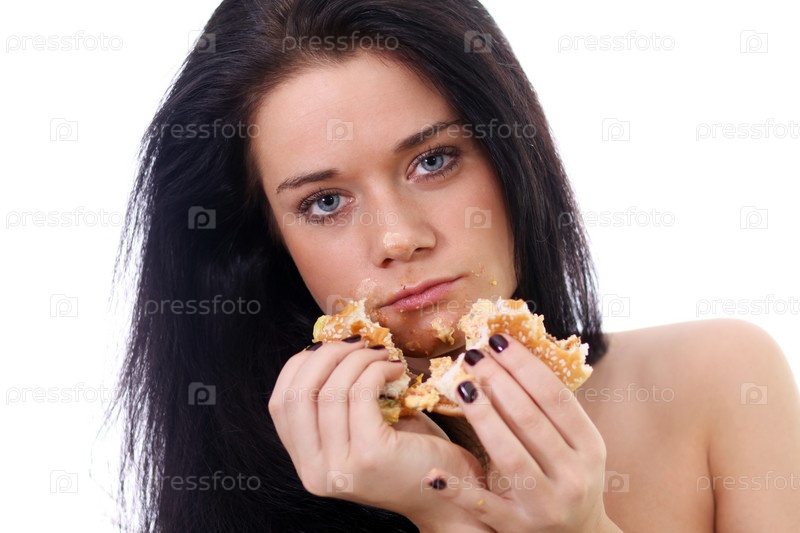 Портрет молодой девушки, кушающей бургер