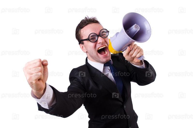 Молодой предприниматель с громкоговорителем на белом фоне