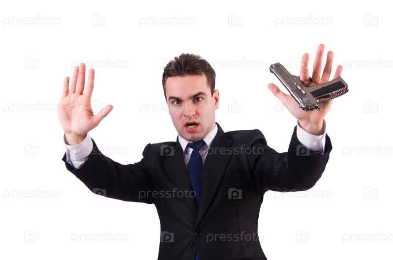 Бизнесмен с пистолетом, изолированный на белом фоне