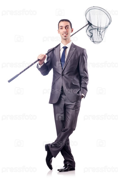 Бизнесмен с сачком, изолированный на белом