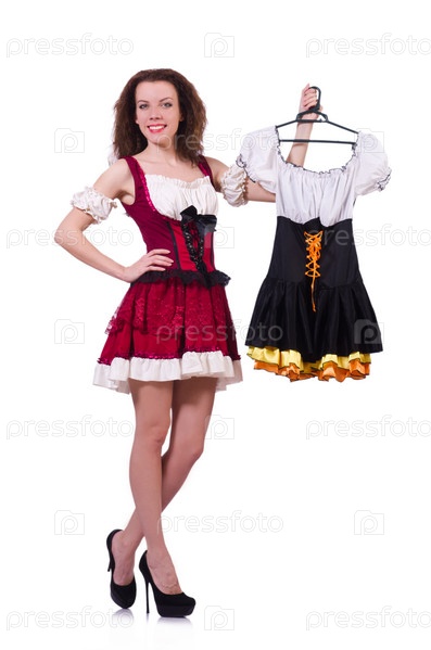 Женщина пытается выбрать платье на белом фоне