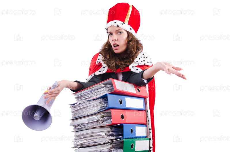 Бизнес-леди в королевском костюме, изолированная на белом фоне