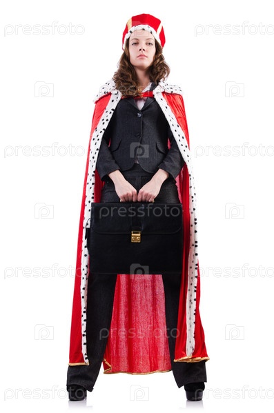 Бизнес-леди в королевском костюме, изолированная на белом фоне