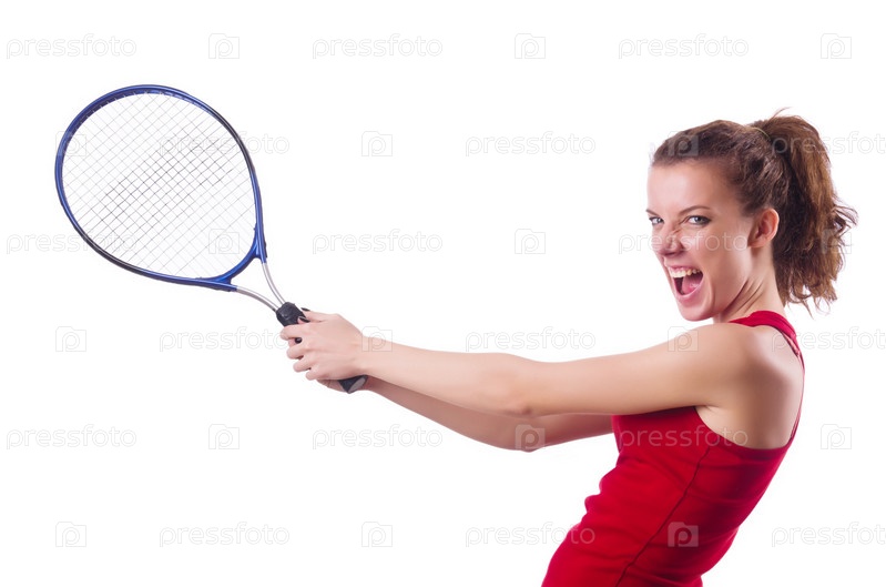 Женщина играет в теннис на белом фоне