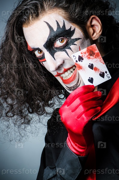 Злой клоун с картами в темной комнате