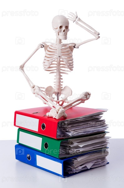 Скелет с стопкой папок на белом фоне