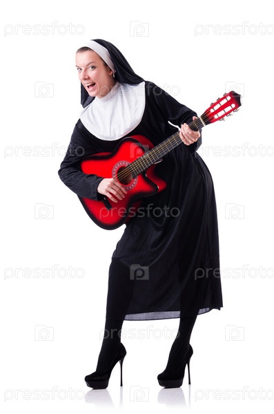 Монахиня играет на гитаре, изолированная на белом
