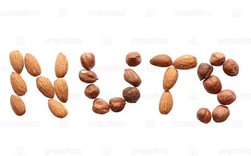 Слово "ОРЕХИ", выложенное из различных орехов на белом фоне
