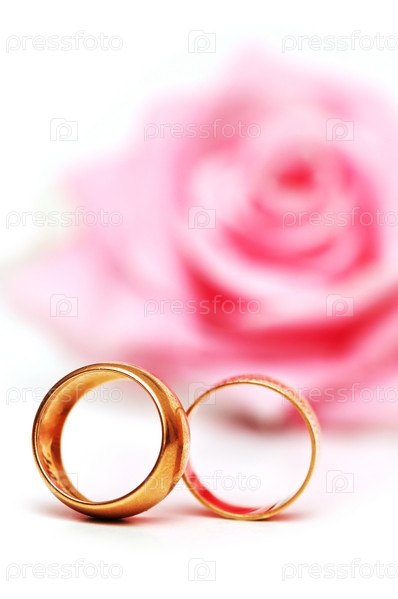 Розовые розы и обручальные кольца на белом фоне