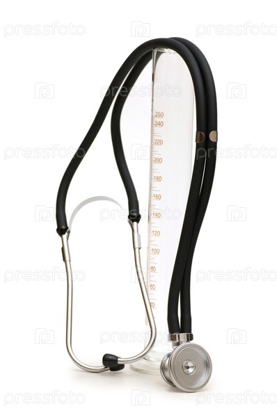 Стетоскоп и мензурка на белом фоне