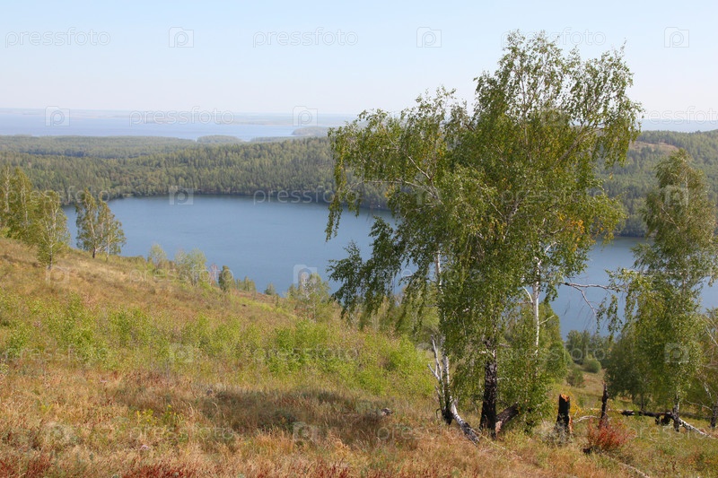 Пейзаж с березами, соснами и озером