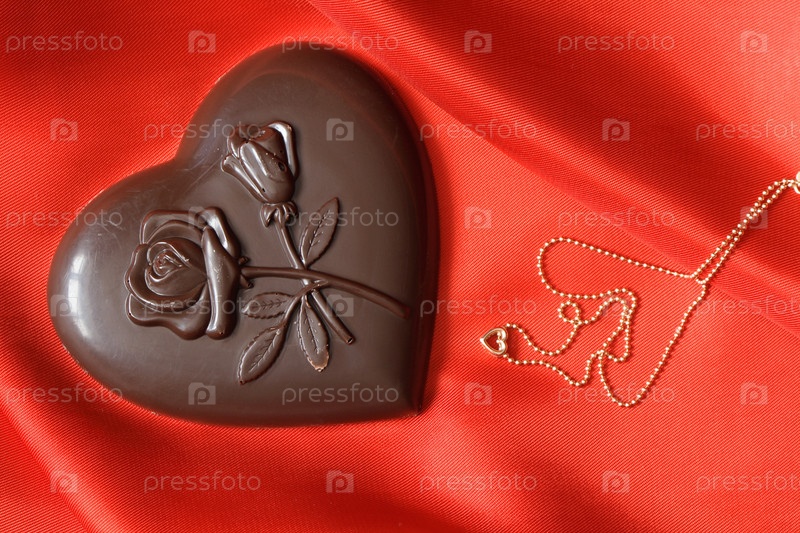 Шоколадное сердце и цепочка на красном фоне