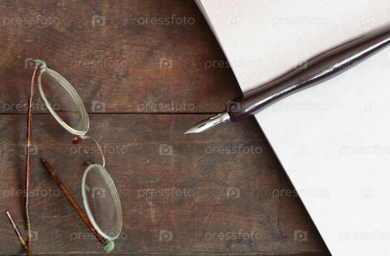 Старые очки и перо крупным планом