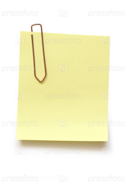 Желтый листок со скрепкой на белом фоне