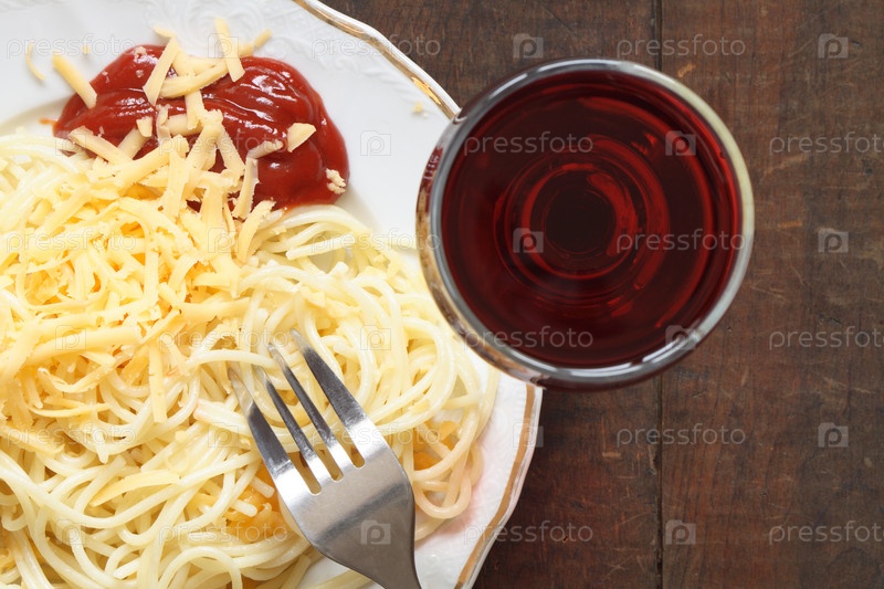 Тарелка спагетти с сыром и кетчупом и бокал вина крупным планом