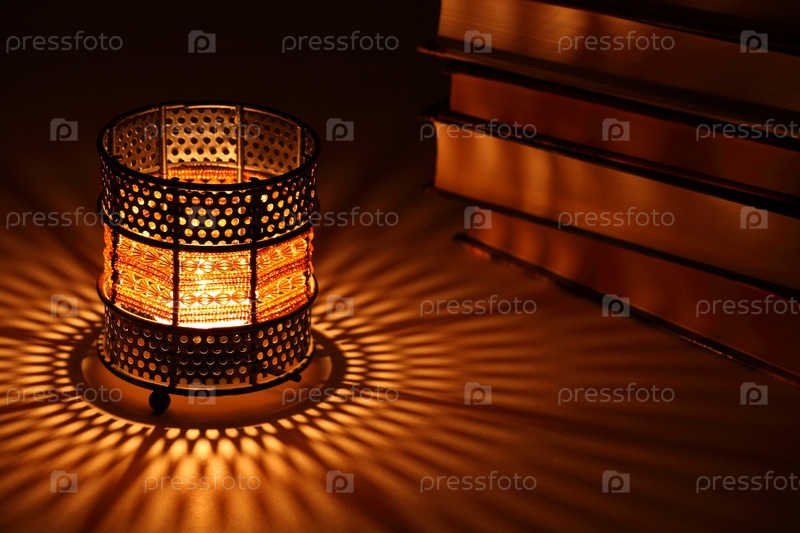 Подсвечник в старом стиле с горящей внутри свечой и несколько книг в темноте