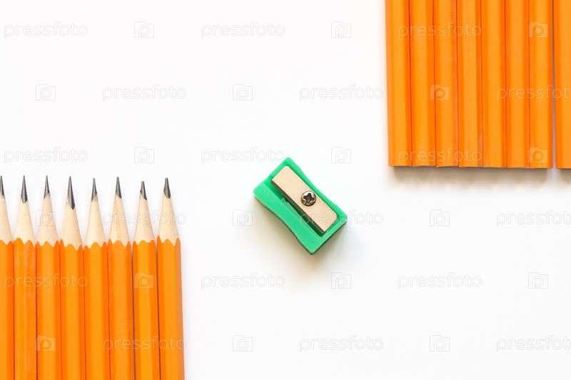 Острые карандаши и точилка на белом фоне