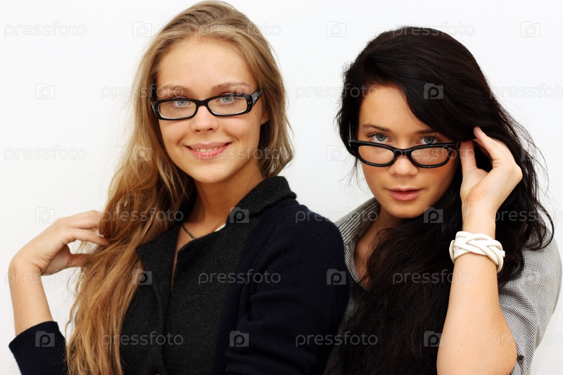 Пара молодых девушек в очках на белом фоне