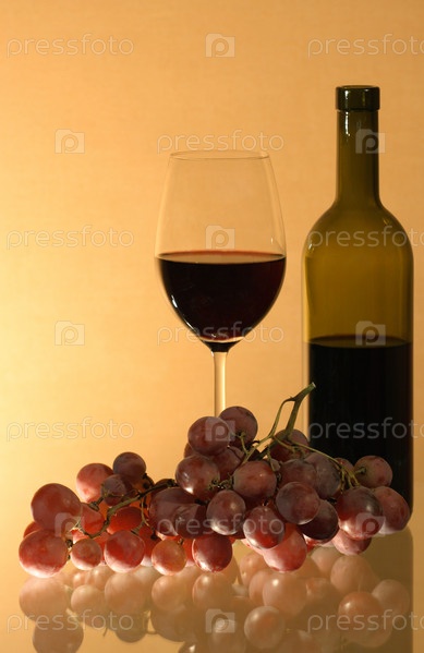 Натюрморт из бутылки и бокала с вином и гроздью винограда