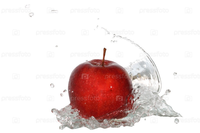 Красное яблоко в воде на белом фоне