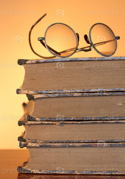 Стопка старых книг и очки на желтом фоне