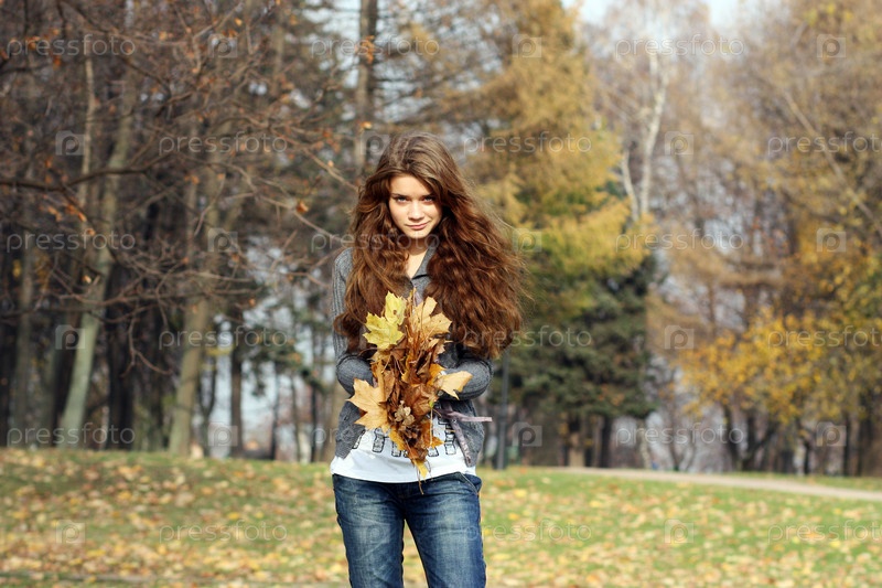 Молодая девушка с охапкой опавших листьев в руках