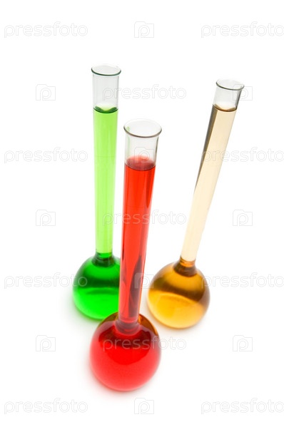 Колбы с разноцветной жидкостью на белом фоне