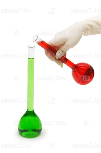 Рука в перчатке переливает жидкость из одной колбы в другую на белом фоне
